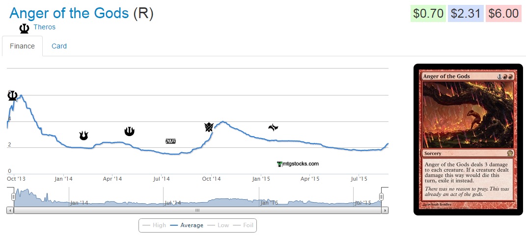 #4 Anger of the Gods (+14.9%) - This three-mana wrath has been showing up more and more in Modern as a way to combat Voice of Resurgence, Hangarback Walker, and ideally turn off one of Kolaghan's Command's modes (the Raise Dead one). This one isn't really showing up in the Grixis decks (as it wipes and exiles all their creatures), but it is showing up in Jund sideboards--so its demand is heavily tied to Jund's success on the circuit.