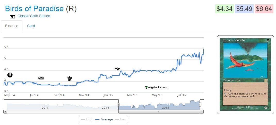 #5 Birds of Paradise (+13.7%) - This is our second 6th Edition card to show bigger positive gains this week (the first being Shatterstorm). Birds has always been a relatively popular casual card. It hasn't been Standard-legal since M12 was in rotation, and looking over the SCG site we see they are sold out of most of their Birds of Paradise.