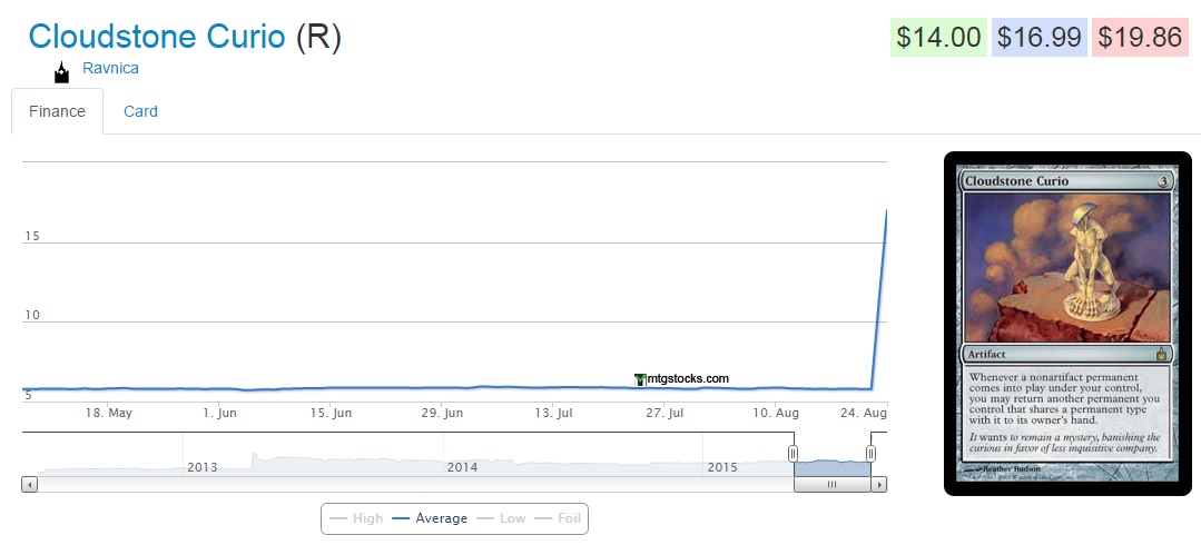 #1 Cloudstone Curio (+193.9%) - This is our biggest gainer the past week, almost all of it thanks to SCG Charlotte and Mr. VanMeter's deck tech. This card allows an Elves player to repeatedly cast one-drop elves and untap their Nettle Sentinels each time. With three Sentinels, a Heritage Druid, and any other one-drop elf, you can make infinite mana with the Curio in play.