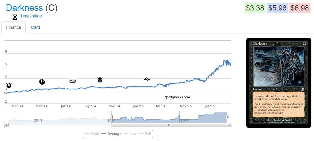 #3 Darkness (+17.3%) - This was a relatively obscure card for a long time. It was highlighted on camera a while back with the Mono-Black 8-Rack decks, which since then have fallen into relative obscurity. Reviewing this past weekend's SCG Open lists I did not see any reference to this card in either the Grixis Control decks or the Lantern Control (piloted by Ali Antrazzi).