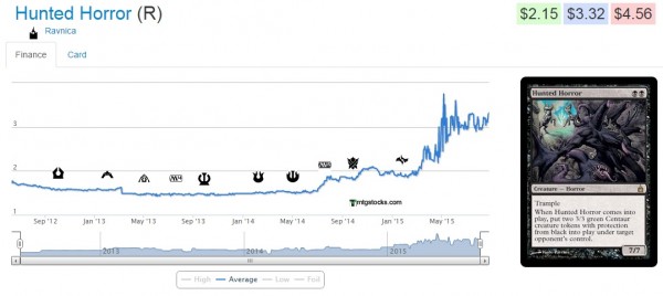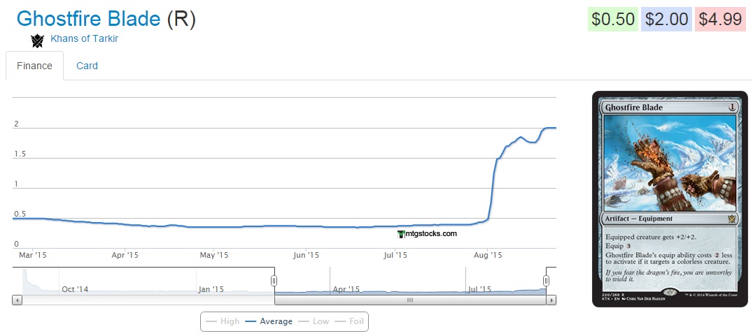 The addition of Hangarback Walker and Thopter Spy Network into Standard has brought new life into this spec target, by creating cheap colorless flyers. With the spoiling of cheaper Eldrazi, players also seem to be betting that Ghostfire Blade could be part of some Eldrazi-type deck when BFZ releases, so they are stocking up on their personal playsets.