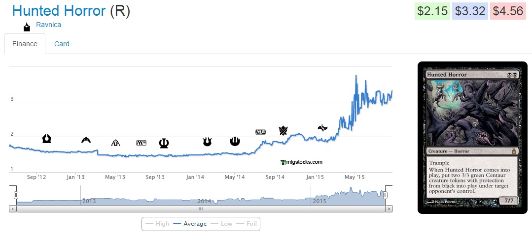 #10 Hunted Horror (+6.8%) - This is an interesting one, an incredibly undercosted creature with trample. The downside of giving your opponent two 3/3 green creatures with protection from black can easily be mitigated thanks to the recent token hosers printed (Illness in the Ranks and now Virulent Plague).