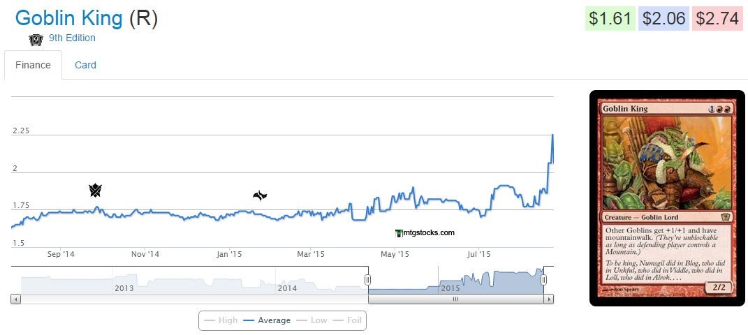 #9 Goblin King (+9%) - Right below Elvish Champion we have a different tribal lord without a recent printing. I know a lot of people are trying to make a Goblins deck in Modern and it does seem to have a lot of potential, but I think the biggest thing holding it back currently is its limited ability to interact with the opponent. Unlike in Legacy, the deck lacks the land disruption (Rishadan Port/Wasteland) package that allowed the Legacy version to remain so powerful.