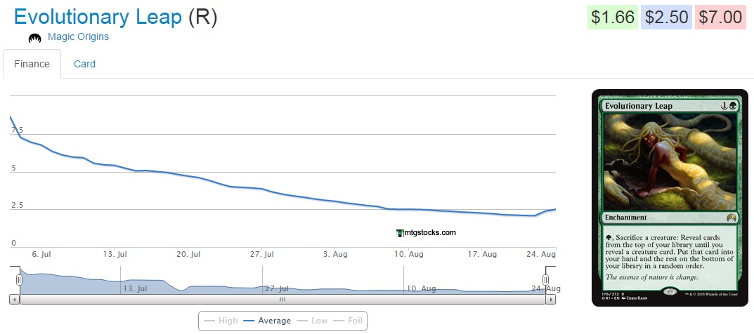 #7 Evolutionary Leap (+11.1%) - When this card was first spoiled it was preselling near $10. Sadly, it hasn't really found a big home in Standard yet (though using it to sacrifice Deathmist Raptors when you're about to unmorph something does give green a pretty solid card advantage engine). It's also decent against spot removal and plays exceptionally well with Hangarback Walker.