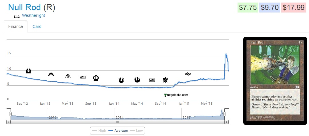 #3 Null Rod (-27.9%) - If you ever wanted to see how Eternal Weekend can affect a card's price, we have the perfect example here. Null Rod is the most efficient way to turn off your opponent's Moxes/Lotus and it can be played in any deck. It saw a pretty big price hike leading into Eternal Weekend, but now that the weekend is over, it appears the buyers want to sell back out.