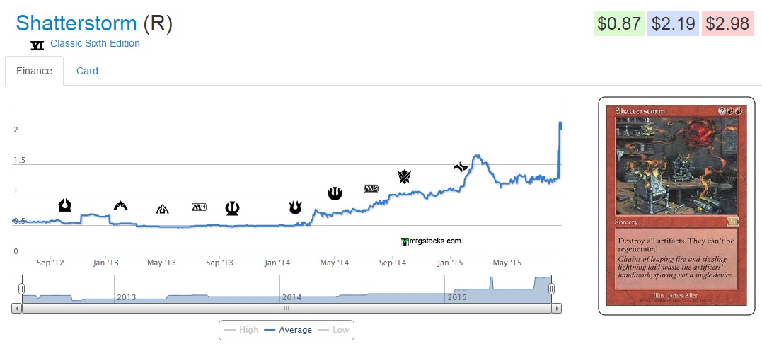 #2 Shatterstorm (+26.6%) - With the recent success of the Grixis decks in Modern, it's not surprising that they would look to pick up another answer to Affinity (though they already have Kolaghan's Command for targeted removal with upside). Shatterstorm provides a nice wrath effect against Affinity in red (though I did not see this one show up in either of the SCG Open top 32 Grixis Control decks).