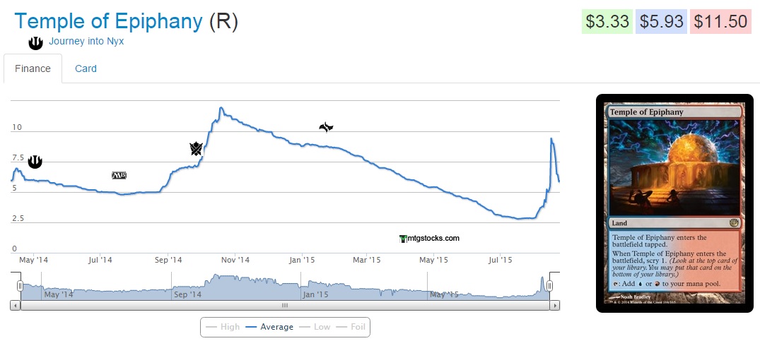 #2 Temple of Epiphany (-34.1%) - When it first came out, this temple was expected to be the most valuable in the long run (just as Steam Vents is the most valuable shockland) due to the dominance of URx decks in Modern. However, it has yet to be adopted by any archetype, given there are so many other options. Any land that comes into play tapped in a format with a lot of turn four kills better come with strong upside--apparently scrying 1 just isn't enough.