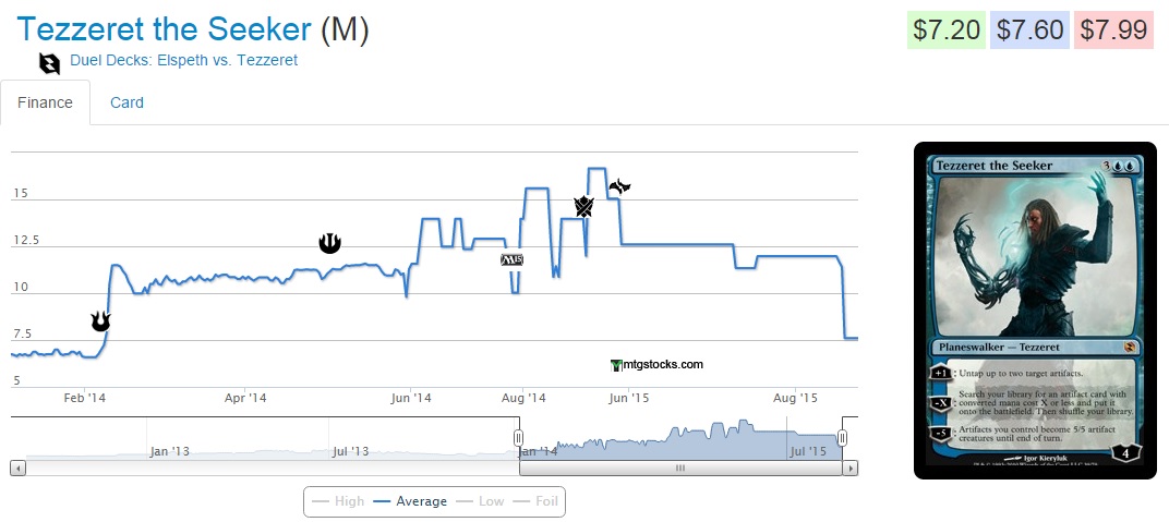 #1 Tezzeret the Seeker (-34.9%) - While a good casual favorite, the recent reprinting in MM2015 (even at mythic) has clearly satisfied what little demand there was for this card. Though looking at the graph it does imply there may have been a glitch with the data collection software used by MTG stocks (hence the odd flatlines and immediate drops).