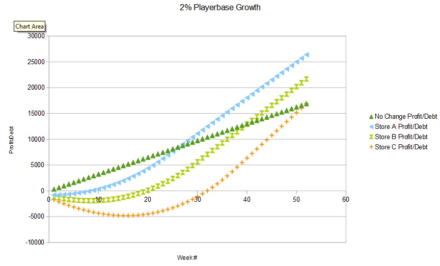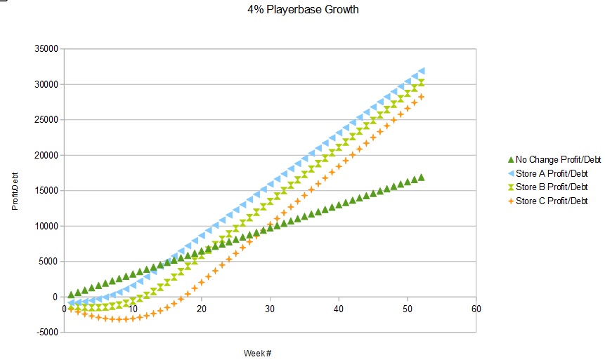 | Week # | Playerbase | No Change Profit/Debt | Store A Profit/Debt | Store B Profit/Debt | Store C Profit/Debt | Playerbase Growth Rate |