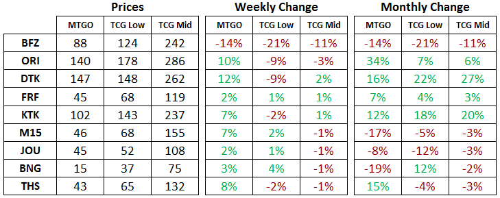 Except for Battle for Zendikar (BFZ), all MTGO set prices are green this week. This is a clear indication that the liquidity crunch around release events is over and prices are stabilizing as a result. For those who have been waiting to deploy tix, the bargains will be fewer and farther between than last month.