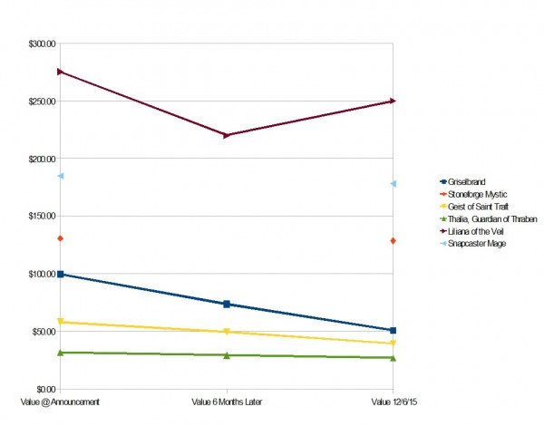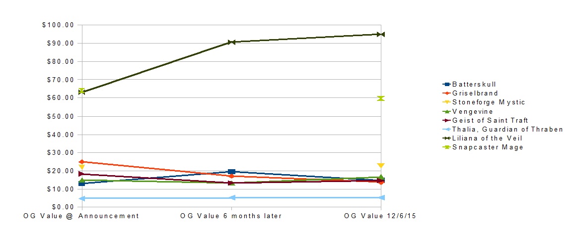 | Promo | Type | Date of Announcement | OG Value at Announcement | OG Foil Value at Announcement | OG Value 6 Months Later | OG Foil Value 6 Months Later | OG Value 12/6/15 | OG Foil Value 12/6/15 |