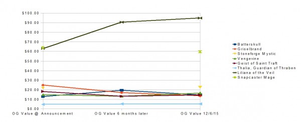 Two others appear to have gone up. Thalia's price looks more flatline than positive, and could be an artifact of the way prices were calculated. Batterskull, however, showed true positive growth (followed by a decline once copies saturated the market.)
