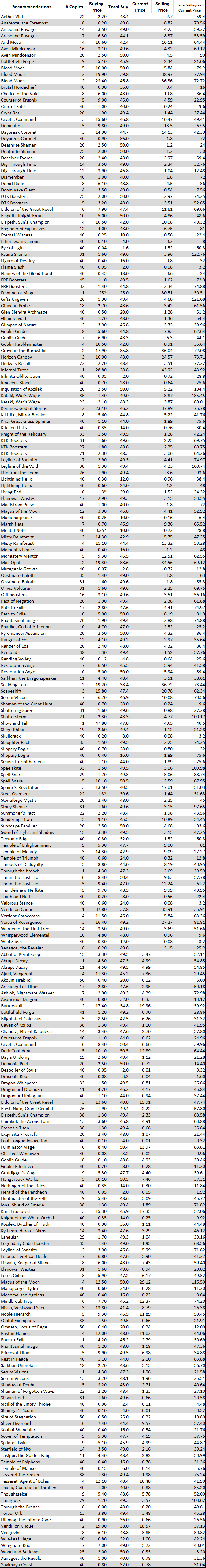 Prices head lower into the summer as the weather improves, and any card that isn't seeing play in Standard will plumb new lows as the calendar ticks over into June and July. Don't be afraid to jettison failed specs in May. Holding losing positions into the summer is a recipe for further pain as prices inevitably head lower. There's always a few cards that buck this trend, but speculators are rewarded for being mostly correct and sticking with the broad trends.