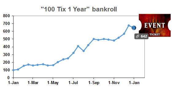 The bankroll grew by 13% in the final month of December to finish at a whopping 642 tix after 365 days! This is clearly higher than I anticipated.