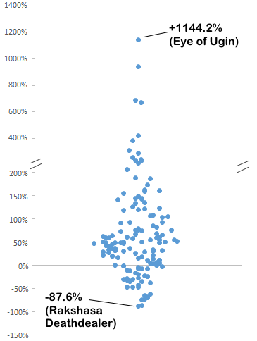 +80.31% is the average gain across the 141 positions mentioned above. The percentage gains ranked from -87.58% (Rakshasa Deathdealer) to +1,144.23% (Eye of Ugin). If the average gain per position looks impressive, it's mostly the result of speculating with cheap or bulk cards. Even with a bigger spread that can eat some of the potential profit, cheap cards tend to be more volatile---doubling or tripling on bulk or near-bulk specs is common practice.