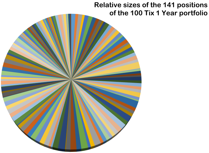 Each color of this pie represents one position. Positions purchased within the first months involved fewer tix on average than positions purchased towards the end of the project, but their share relative to the bankroll size was a fairly constant number---2.85% on average.