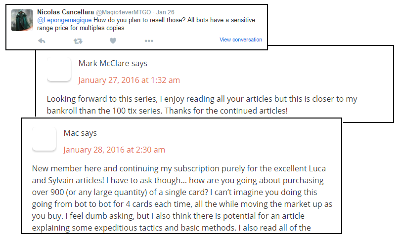 The buying strategy is fairly simple. Between MtgoLibrary Bots, Mtgotraders, Goatbots and others I bought one playset at a time, and more than one playset when authorized with bots such as Goatbots and Mtgotraders.
