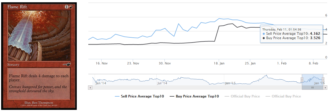 With the launch of Legacy Leagues you can expect to see an uptick in the value of Legacy staples on Magic Online. In my experience, Miracles has been the most popular Legacy deck online, and I'd definitely look there for some cards to invest in. Burn is the de facto budget option for Legacy, so I'd look there for pickups as well. I'm not sure how much play that Flame Rift sees in Legacy burn these days, but I do know that the card sells for about four tickets and sees a bump as is due to being from Nemesis- a set never actually released on Magic Online.