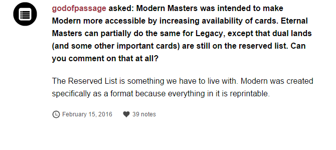 Many would argue the solution to "no-Reserved List Legacy" was the Modern format, but I don't think that's true. I think Maro's response implies that Modern was created for a reason, but that the solution doesn't stop there. Modern has its own issues, from price spikes, to regulation via the ban list, to card pool.