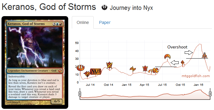 After Modern Masters 2 was released, the price vaulted from about 10 tix to 25 tix by the time Magic Origins was released. By the time Theros block rotated out of Standard, it had sunk back down to about 18 tix. Although the long-run value and price of any individual card is hard to pin down, it had basically overshot its price by about 7 tix in this case.