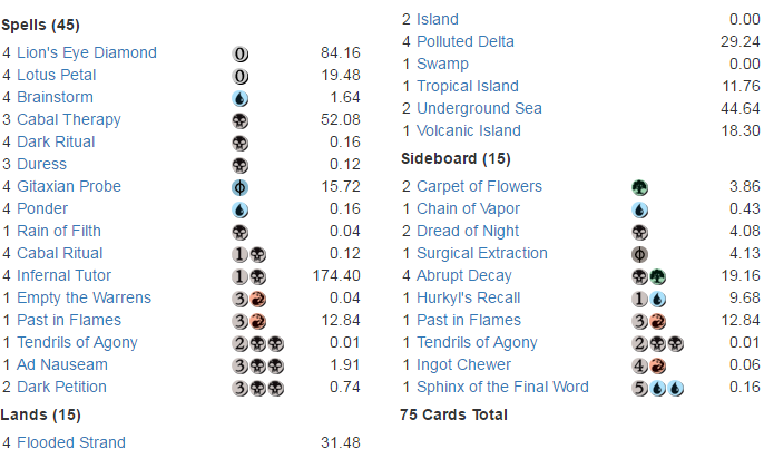 While this is just a guess, I expect Storm to be a Limited archetype within EMA. If so, Lotus Petal, Cabal Therapy, Gitaxian Probe, and Infernal Tutor could all be included. If the deck drops in price, Lion’s Eye Diamond could be the last gatekeeper standing, so to speak. The fact that it figures in other decks as well makes it an attractive target.