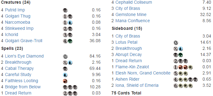 As you can see, almost all the value in Dredge is locked up in four cards: Lion's Eye Diamond, Cabal Therapy, Gemstone Mine, and Golgari Grave-Troll. These four cards account for $220 of the $314 price.