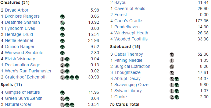 Right now, 30% of the deck’s value is centered in the playset of Gaea's Cradle. These gained in price as soon as EMA was announced, and have room for more gains as the format grows. I expect Elves to be one of the Limited archetypes playable in EMA, which could make the deck even cheaper.