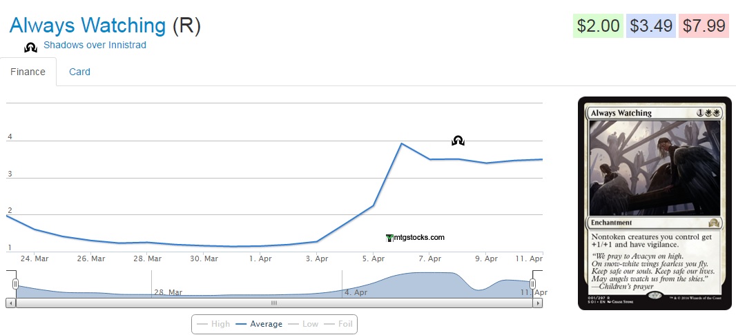 4. Always Watching (+172.4%) - Here's our first gainer due to Standard demand. This card has found a home in the white-based aggressive decks in Standard. It pairs extremely well with Dragonlord Ojutai (turning on hexproof indefinitely thanks to vigilance and putting him out of Languish range). It also combos with another card further down on this list (Archangel of Tithes) by allowing both of the Archangel's abilities to function simultaneously.