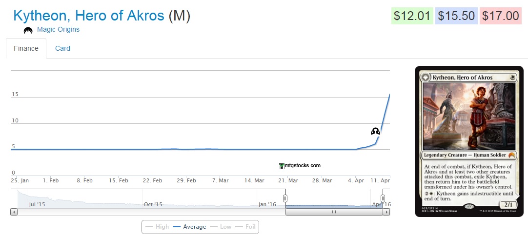 6. Kytheon, Hero of Akros (+139.8%) - Another winner from rotation (or rather the entry of Shadows over Innistrad to Standard). Kytheon was originally touted as one of the better Origins flip walkers but he quickly fell out of favor as midrange decks took over and white aggro decks failed to pan out. With a return to the plane of Innistrad and a resurgence in power of the human tribe, he's found a home in the G/W Human decks that have found an early foothold in this new Standard.