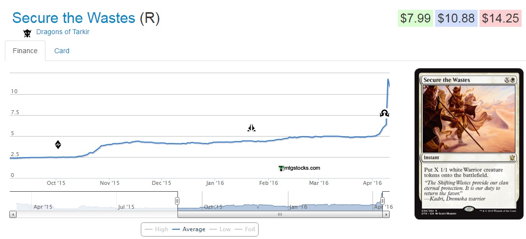 This is another of the cards that gained a lot of early hype but didn't seem to pan out over the weekend. That isn't to say it may not end up better as the metagame matures, but this Dragons of Tarkir rare is sitting at almost $11 now.
