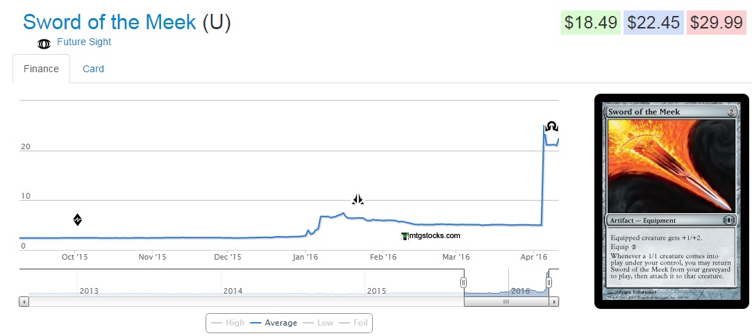 2. Sword of the Meek (+321.5%) - No big surprise here either, even if the unbanning itself caught a lot of people off guard. Hopefully you read the various QS articles discussing whether this card deserved to be on the Modern banned list and acted back then. I know I picked up my four copies back in November 2015 for around $2 each.
