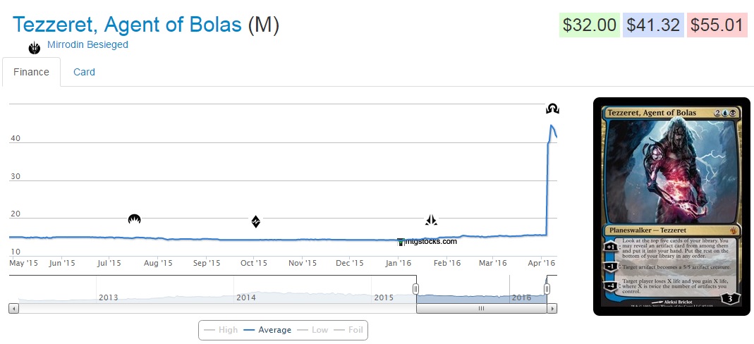 5. Tezzeret, Agent of Bolas (+170.3%) - This one had a higher buy-in price, but nonetheless gained a lot from the Sword of the Meek unbanning. Tezzerator decks haven't ever been Tier 1 in Modern despite the plethora of good artifacts available, primarily because they had a hard time beating aggressive decks.