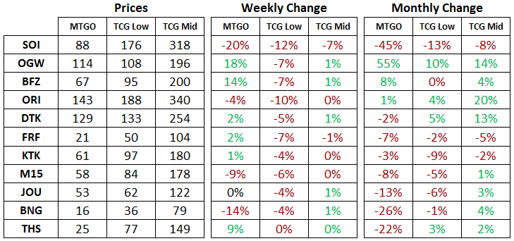 All MTGO set prices this week are taken from Goatbot’s website, and all weekly changes are now calculated relative to Goatbot’s ‘Full Set’ prices from the previous week. All monthly changes are also relative to the previous month prices, taken from Goatbot’s website at that time. Occasionally ‘Full Set’ prices are not available, and so estimated set prices are used instead.