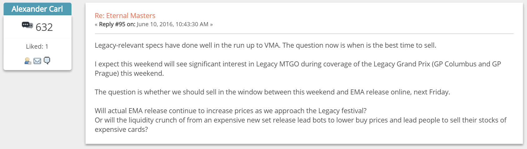 A lot has already happened among Legacy staples, and a lot could still happen. Taking several valid points into account, Alexander Carl in our forum tried to open the dialogue on one of the hottest questions these days---when is the best time to sell these Legacy specs?