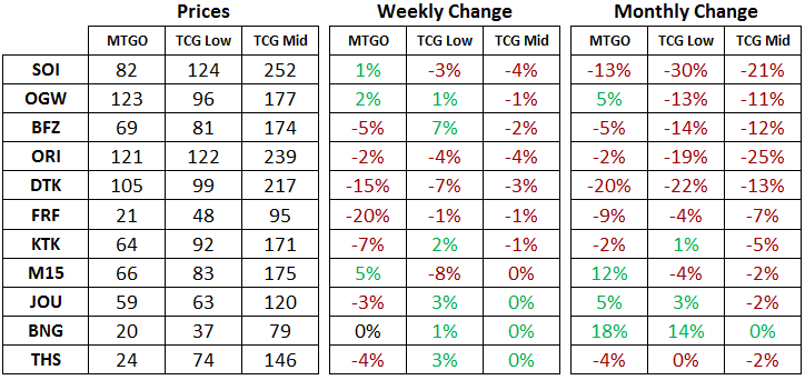 All MTGO set prices this week are taken from Goatbot’s website, and all weekly changes are now calculated relative to Goatbot’s ‘Full Set’ prices from the previous week. All monthly changes are also relative to the previous month prices, taken from Goatbot’s website at that time. Occasionally ‘Full Set’ prices are not available, and so estimated set prices are used instead.