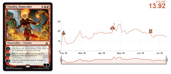 Since a month after release, Chandra has been bouncing between 13 tix and 21 tix, with peaks at 27 tix. That's a wide range. Nowadays it's at 14 which is very close to a historic low and it's going to be in Standard for a long time. The card has proven to be a sweeper staple and could easily return to 20 tix after the release of Eldritch Moon.