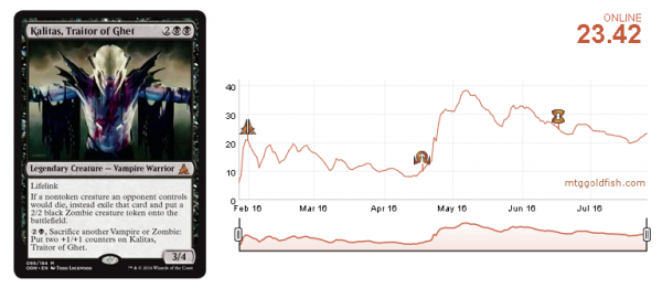Kalitas reached his highest price at the end of April when he was so crucial for countering the Nantuko Husk decks. After that he has managed to maintain a price somewhere in the middle as control decks have started to play him maindeck, and Modern decks have adopted him too.
