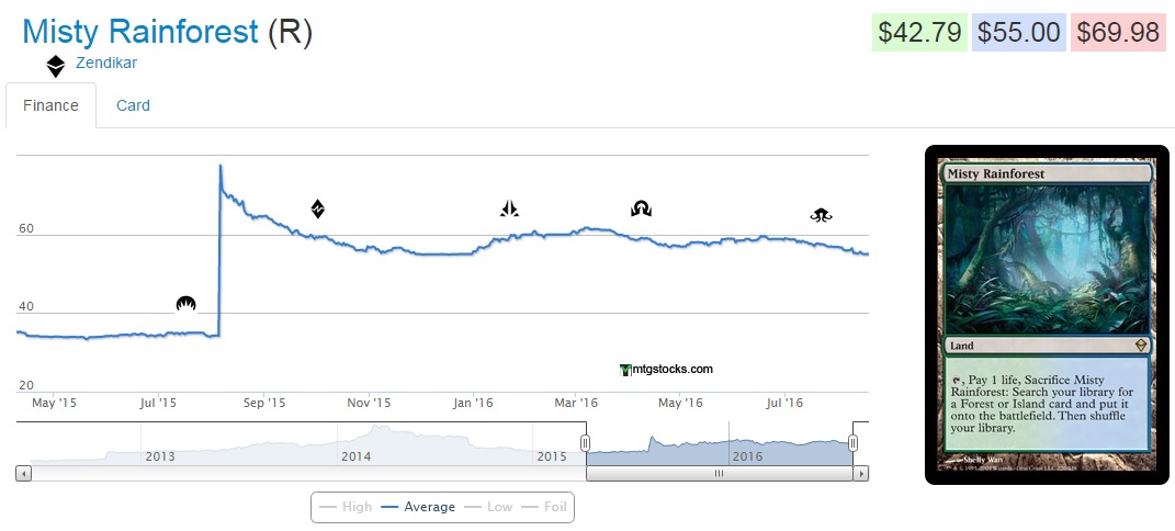 The price on Misty Rainforest has dropped considerably from its high as people seem weary to pick up any of the Zendikar fetchlands for fear of a reprint/spoiling. I still firmly believe WoTC will include them in the next set with an overall weaker power level to help drive sales of sealed product. And you know it will---if they made a set called Fetches or Kitties with people having a 1 in 20 chance of pulling a Zendikar fetch and 19 in 20 of getting a Sanctuary Cat it would still sell well.