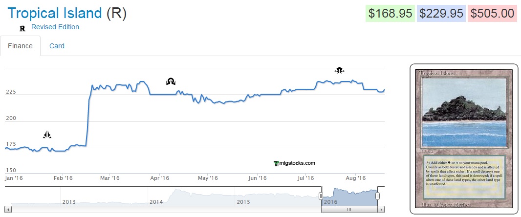 Tropical Island spiked earlier this year, so I don't know if there will be significant enough demand from this reprinting to push it any further upward. It will, however, likely stabilize at the new price.