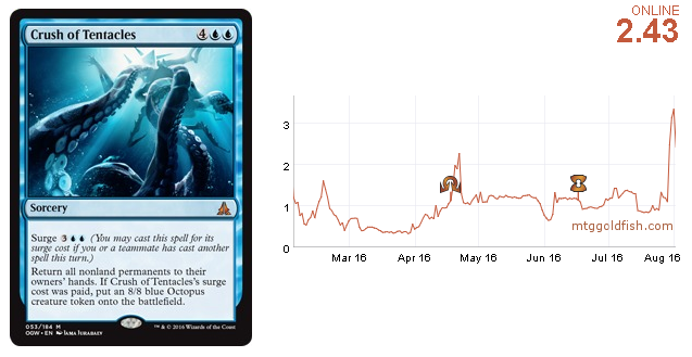 The only reason for Crush of Tentacles to spike so abruptly is the new UG deck that made Top 8 in last weekend's SCG tournament. The card is unlikely to go higher or even maintain the current price---plenty of other pro players must play the card in order for this to happen. Even if the deck is played in a good portion of the Pro Tour metagame, the price could just stand still.