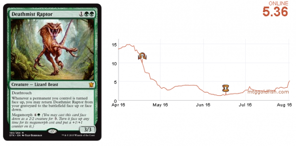This Jurassic Park-esque card has risen up lately but it's not even played that much in the current metagame. Perhaps speculative buyers hoping to see it at the Pro Tour this weekend are the reason behind the rise. Anyway, being from Dragons of Tarkir, a set that will leave the format this fall, is a huge downside.