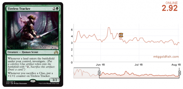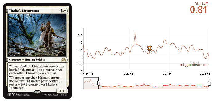 One of the strongest cards in the Humans deck, which seems to have lost popularity in the second week of the new Standard, Thalia's Lieutenant is at its historic low. The trend is very clear here; it bounces between 0.8 and 1.8 tix. The ever-changing Standard metagame makes this effect possible. The card will eventually reach 1.8 again when the deck is played again.