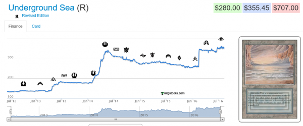To a lesser extent, many other popular Legacy and Vintage cards are soaring to new heights. Underground Sea is at its all-time highs as we speak, notching the $350 mark according to MTG Stocks. It seems like only yesterday this card was hitting $100 at retail, causing a stir in the MTG community. Now we’re looking at a $400 card at retail, with playsets worth enough to trade into any piece of Power except for Black Lotus.