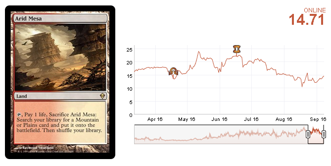 Zendikar flashback draft ended a dew days ago and fetchlands have already rebounded, but I don't think it's a good move to liquidate them so fast, not even if you like the short term strategy as much as I do. A good moment to sell them would be after all Modern Masters 3 have been spoiled. If you check price history of modern staples you will see that many of the staples that weren't reprinted in Modern Master sets spiked really high with a price adjustment after that. I don't think they will reprint them, but it is definitely a possibility, in this case I would sell them as soon as they are spoiled.