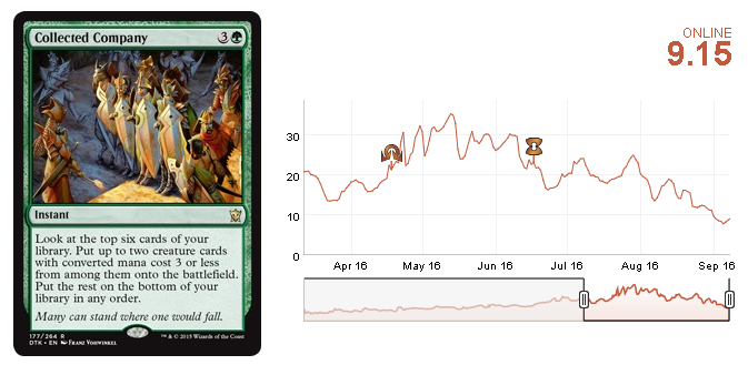 One of the very few cards from the sets leaving standard that is playable in modern is Collected Company. You might be tempted to buy them because they are really cheap, but wait! Just wait a few more weeks, after it leave the format or after the Pro Tour when people would want to change their decks, and you will find a much better price.