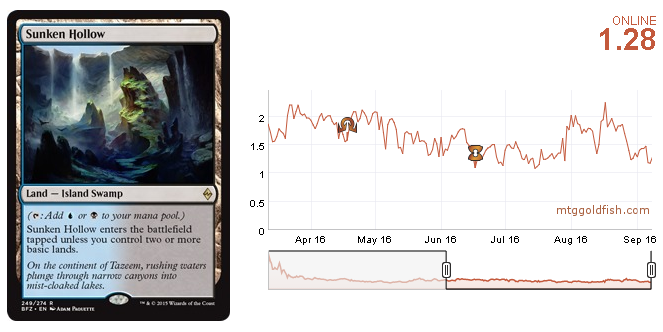 One of the few secure buys this week are cards from BFZ and OGW sets. Sunken Hollow is at the bottom of its trend, so its a good time to buy in. I prefer to sell it for a fast 10% to 20% profit rather than waiting for the Pro Tour for a bigger profit.