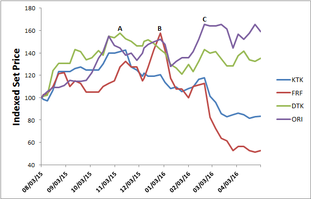 Three key time periods are marked A, B and C. Point A occurs at the end of October and into early November of 2015. In this time period, all four sets found at least a near-term price peak. For DTK, it is the highest price for the whole time period, peaking on November 9 at 150 tix with an indexed value of 158. KTK sawĀ its highest price a week later at 104 tix, with an indexed value of 142. ORI found a near-term price peak on October 26 at 140 tix and an indexed value of 155. The smallest gain around that time was for FRF, which also saw a near term price peak at 53 tix on November 16, with an indexed value of 133. All of these price gains can generally be seen tracking interest in Magic ramping up from the end of summer and into the new fall Standard.