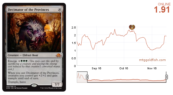 Decimator of the Provinces was played once more in SaffronOlive's budget deck. Every time his decks are published investors jump in immediately, buying out the deck's cards and creating a financial bubble that pops a week later. I was holding a bunch of those big pigs and this is a quick boost to my portfolio. I will buy them again when they crash to 1 tix.