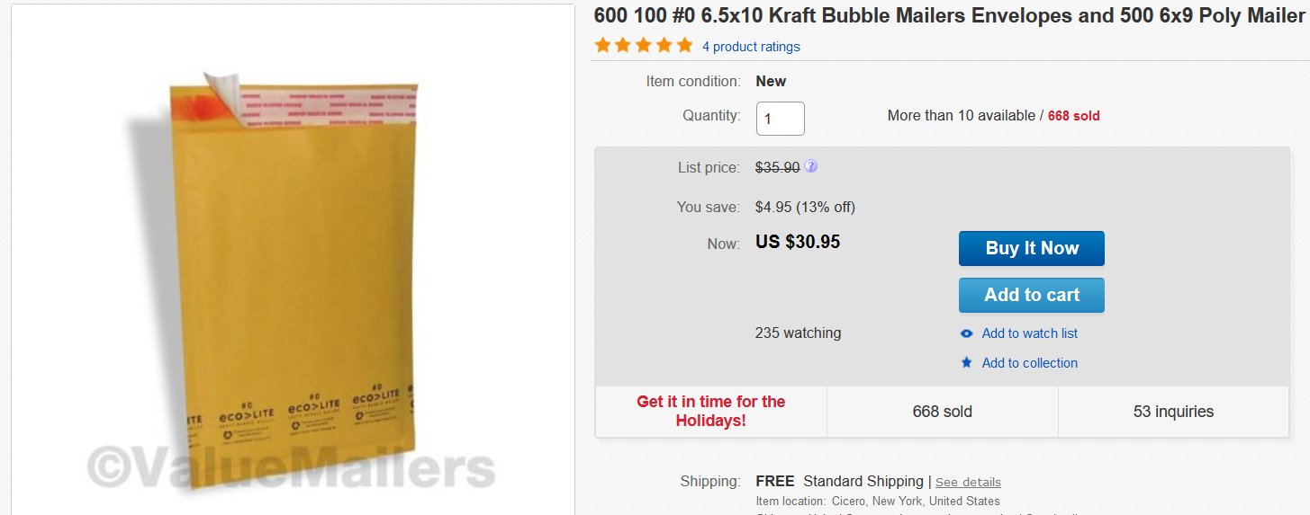 There are many flaws with this system that I have since corrected. It’s fairly obvious I was overpaying for my bubble mailers—I have since begun purchasing bubble mailers in bulk 100 at a time to drive cost per envelope down to $0.19 or so. If you do larger volume, you can drive that piece price down even further by purchasing 500 at once—less than $0.07 per envelope! And I now can print my postage online using the PayPal shipping tool, eliminating the need to go into a post office to mail cards.
