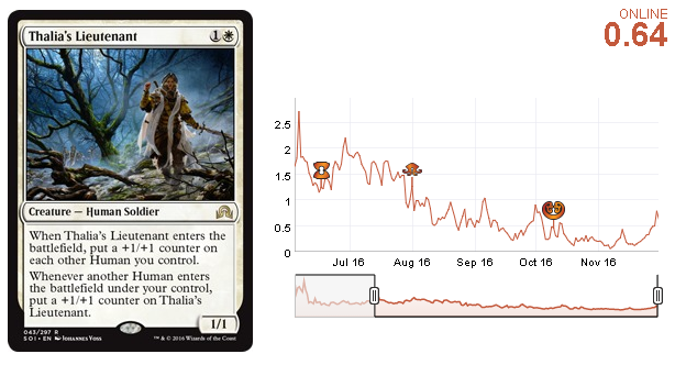 Another card similar to Tamiyo in that I would sell it right now if there were no big tournaments this weekend. Thalia's Lieutenant has spiked in the last few days, and some WR human aggro decks could be the responsible for this. I'm not completely sure about the reason, so I will hold them until the weekend to confirm more increases aren't coming.